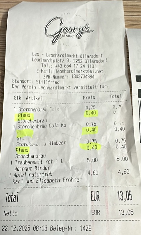 Das ohnehin nicht ganz unumstrittene Flaschenpfand treibt erstaunliche Blüten, wie wir in diesem Beitrag aufzeigen. Wobei es in diesem Fall nicht um die Summe, sondern ums Prinzip geht. Ein Mann aus Waidendorf/March kaufte am 22.12.25, in der nächstgelegenen Ortschaft Stillfried/March, beim Verkaufsautomaten am Bahnhof einige Getränke. Darunter befanden sich auch drei Pfandflaschen (Storchenbräu). Die Pfandgebühr betrug je Flasche 40 Cent.